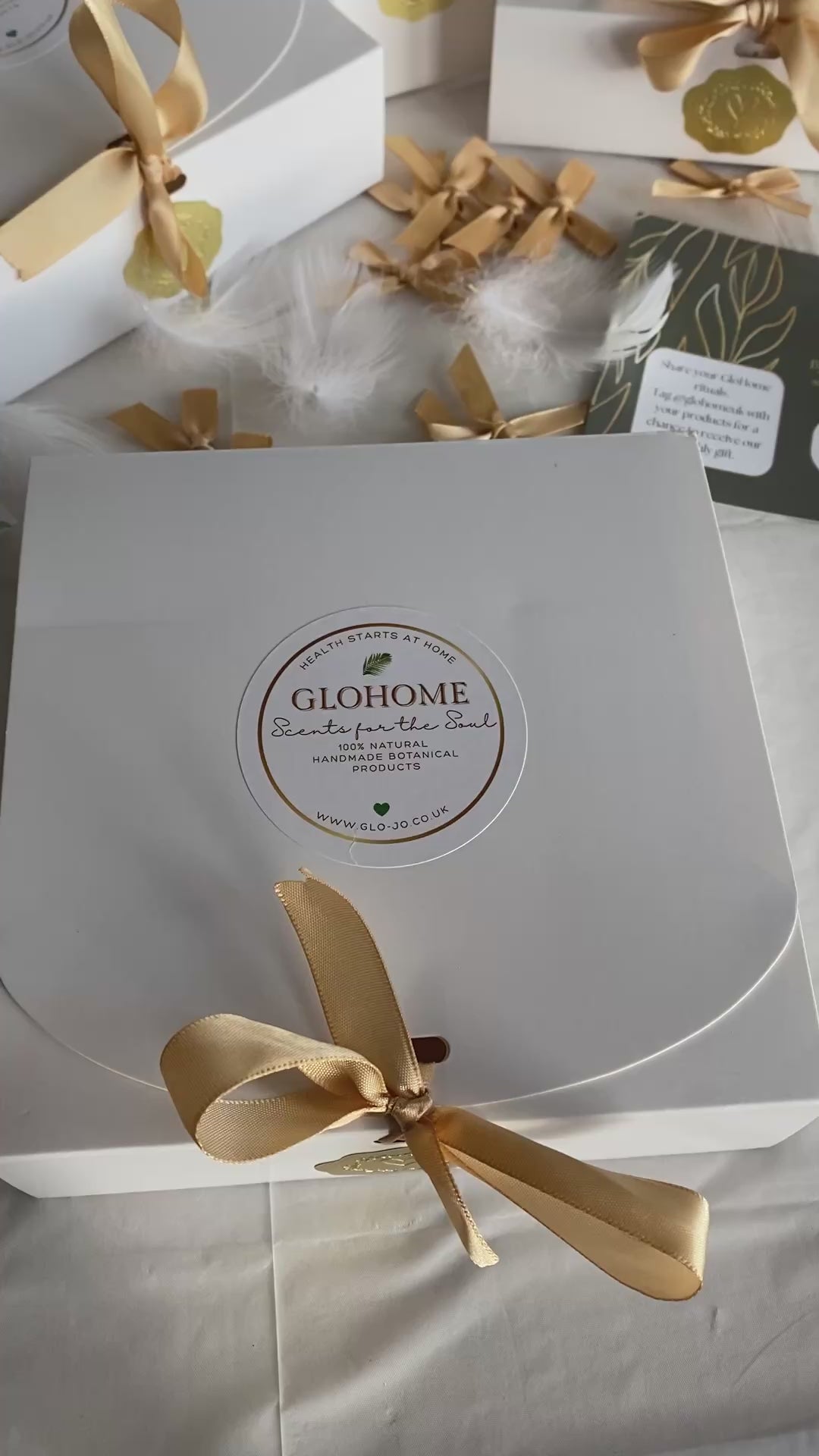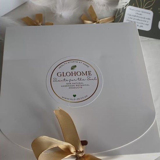 Each box is lined with white tissue, adorned with gold ribbon, and elevated with a delicate white feather — a signature GloHome symbol of lightness and protection.